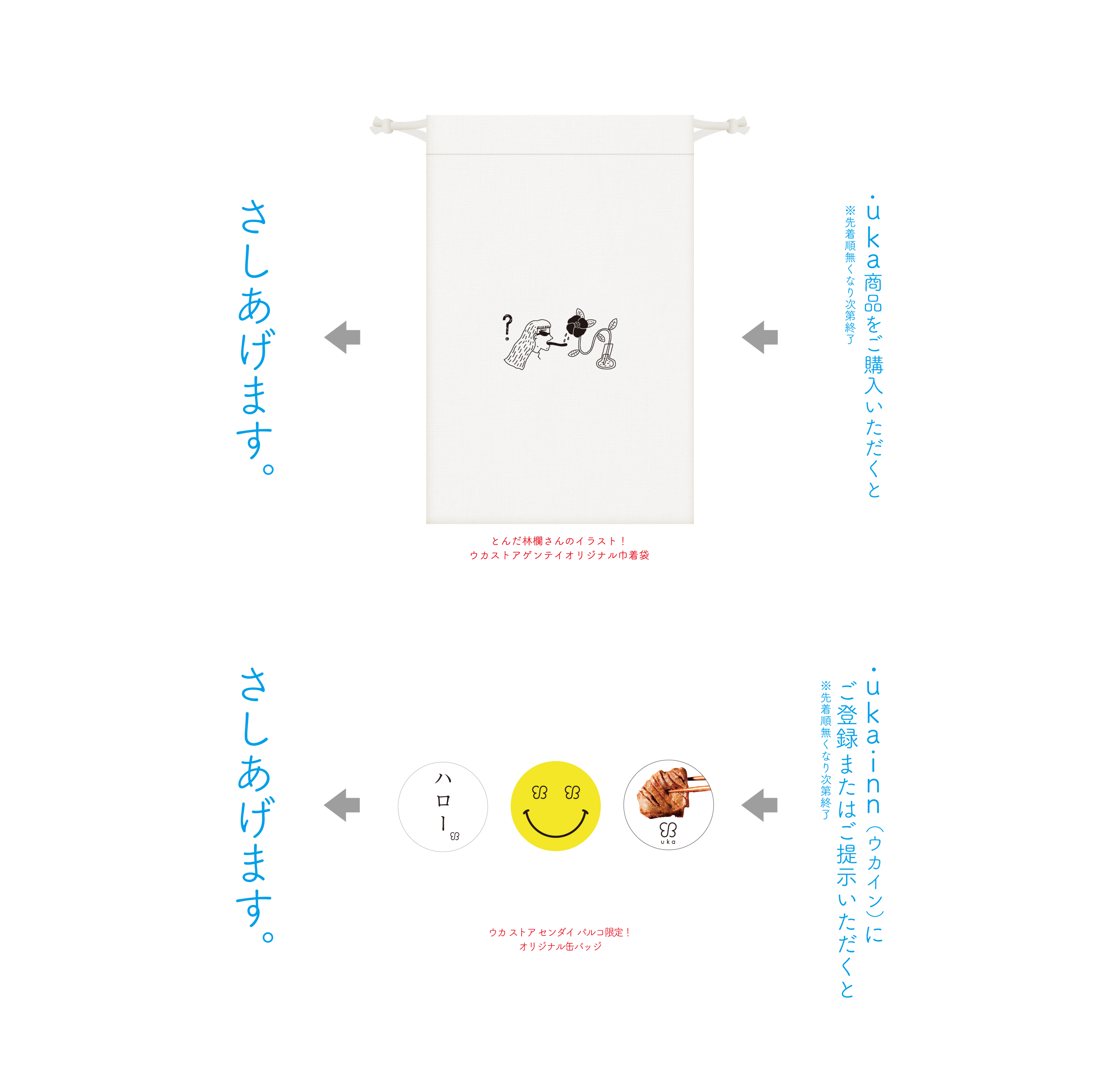 ・ご来店時にukaの会員プログラムukainnのマイページのご提示、またはその場で入会いただいた方に、ウカストアゲンテイ缶バッジをプレゼント。