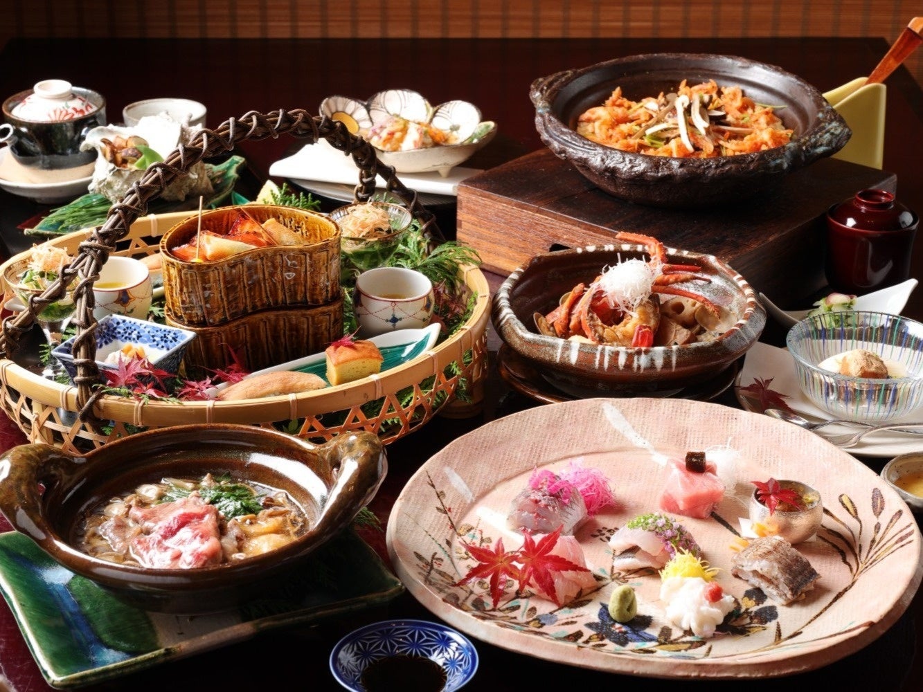 赤沢迎賓館のお料理は、伊豆の海が育む海鮮や地産の厳選素材を使用し、四季折々の味覚をお愉しみいただけます。美しい器に彩られた品々は、移ろう季節の気配とともに日本の恵みを感じられるようご用意いたしました。特に、新鮮な魚介類を味わうお料理では、旬の恵みが持つ豊かな旨味と繊細な余韻を存分にご堪能いただけるよう仕立てております。庭園を望む席を中心に、全室個室の落ち着いた空間で、贅を尽くしたひとときをお過ごしください。