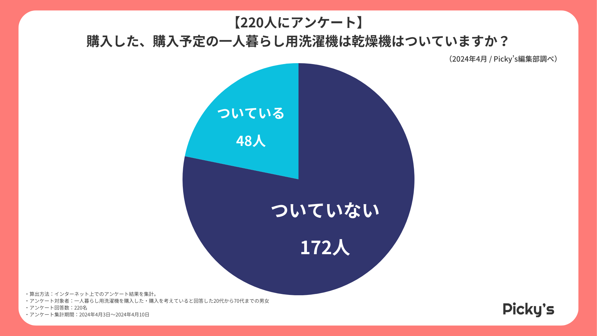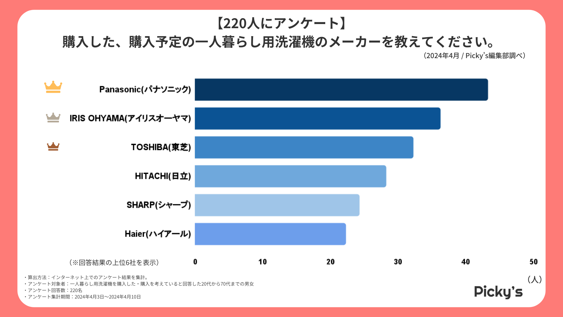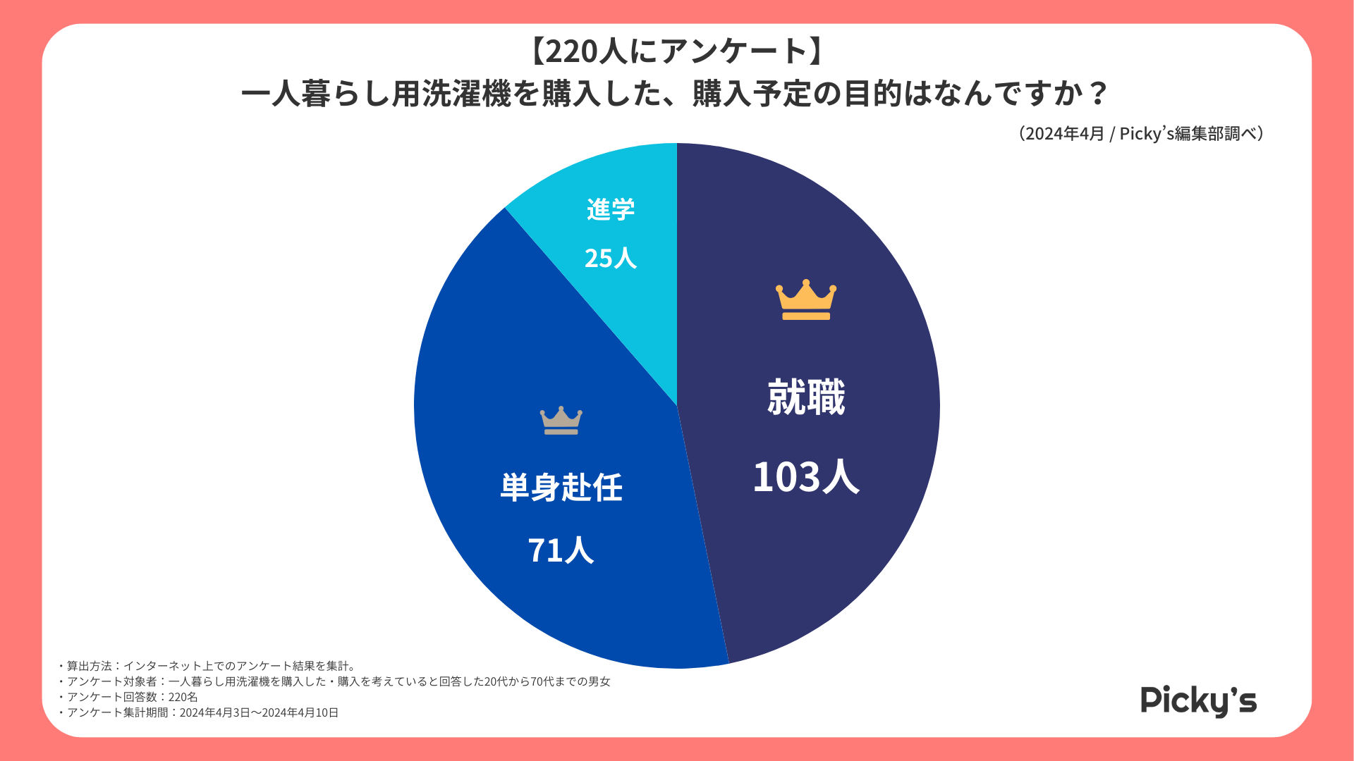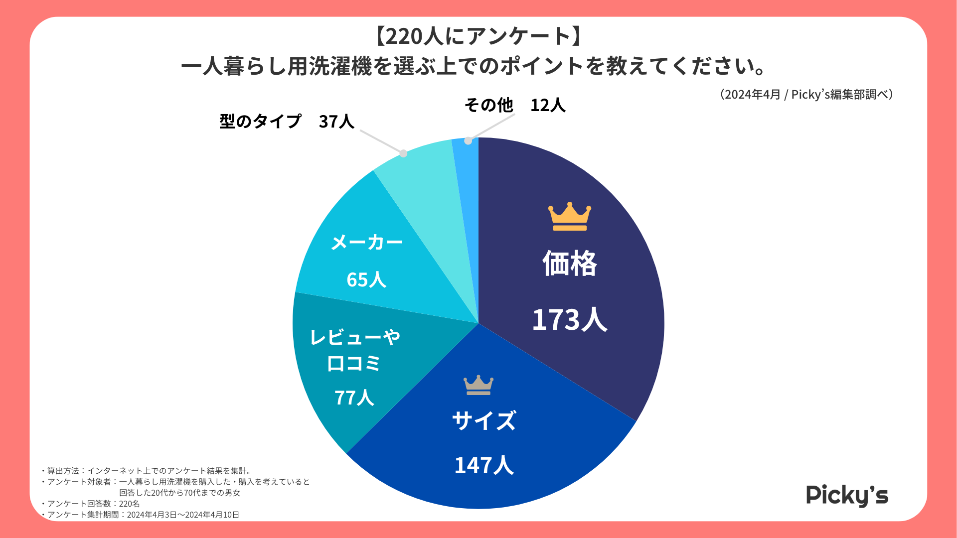 「Picky’s」は、インターネットショッピングにおいて、購入前に試せない・選ぶべきものがわからないという課題の解決を目標に、あらゆる商品のおすすめランキングや検証レビューを紹介するサイトです。このたびPicky’s(https://rentry.jp/)では、春の新生活に先駆けて、一人暮らし用洗濯機についてインターネット上でアンケート調査を行いましたので発表いたします。