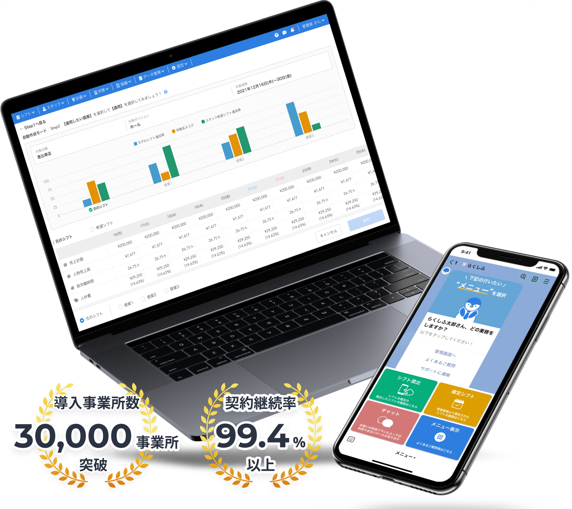 クラウドシフト管理「らくしふ」、公式アプリ「らくしふ TeamApp」、シフトを自動作成する「らくしふ オートメーション」、自社専用スポットワークサービス「らくしふ タレントプール」などを通じて、シフト作成・コミュニケーション・人材活用までを一気通貫で支援します。