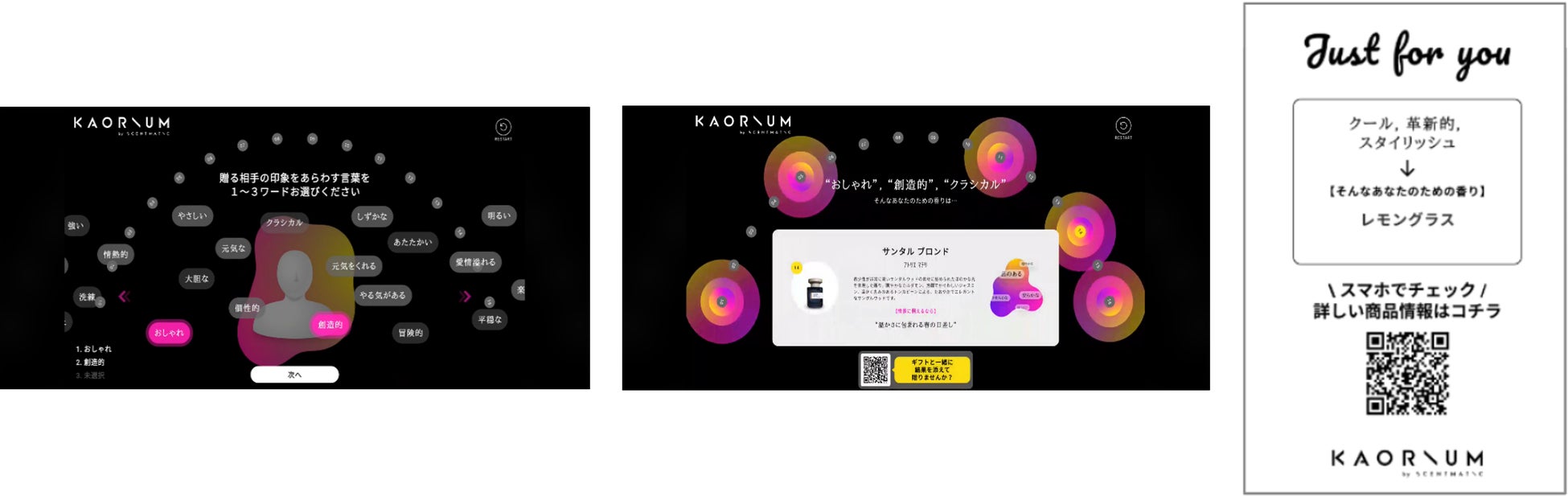 KAORIUM初の試みとなるギフトモードでは、お選びいただいた香りをそのままギフトとして贈ることができる、新しい楽しみ方をご提案します。贈る方をイメージした言葉から香りを探す体験となります。体験の最後に選択された香りの情報がQRコードとして発行されますので、商品と一緒にプレゼントすることができます。