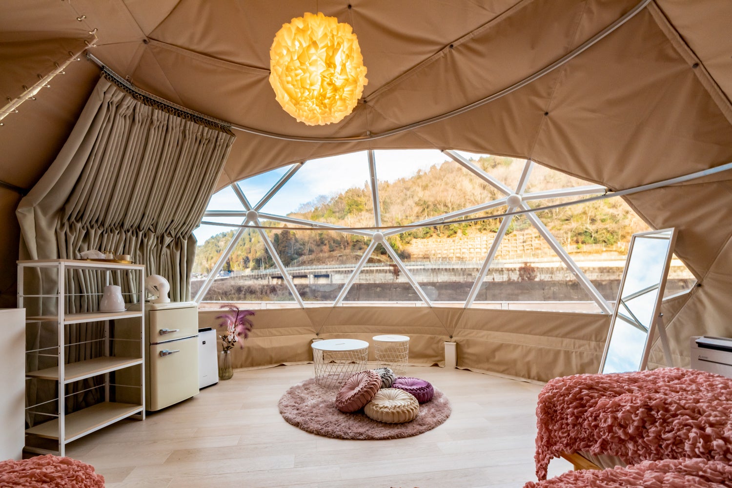 長良川の清流が間近に感じられる「長良川リバーサイドグランピング KITEN – キテン – 」では1日3組限定で、優雅なグランピングを満喫するドームテント滞在を楽しめます。カップルやご夫婦、ファミリーからグループ利用と幅広い滞在を。川のせせらぎをBGMに、豊かな自然と調和するグランピングをお楽しみ下さい。