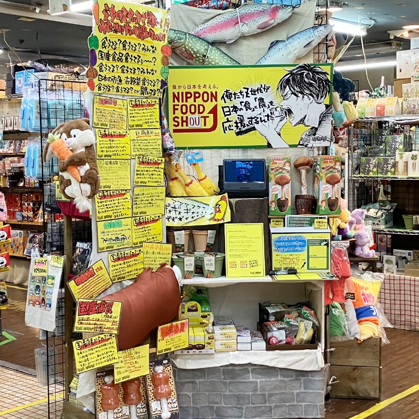 遊べる本屋「ヴィレッジヴァンガード」は、ニッポンフードシフトの取組に共感し、令和5年11月に独自企画「NIPPON FOOD SHOUT」のプロモーションのために農林水産省を訪問・プレゼンテーションを行いました。ヴィレッジヴァンガードの特色を活かした前向きな解釈の下、自発的な提案企画を関東4店舗(渋谷本店、下北沢店、PLUSイオンレイクタウンmori店及びトレッサ横浜店)にて先行実施してきました。