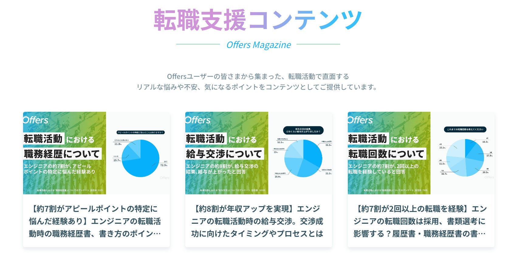また、Offersユーザーの皆さまから集まった、転職活動で直面するリアルな悩みや不安、気になるポイントをコンテンツとしてご提供しています。