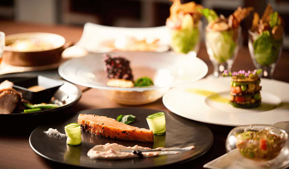 料理オリンピックメダリストが腕をふるうこだわりのメインディッシュやジュエリーのようにきらめくスイーツに心が躍ります。