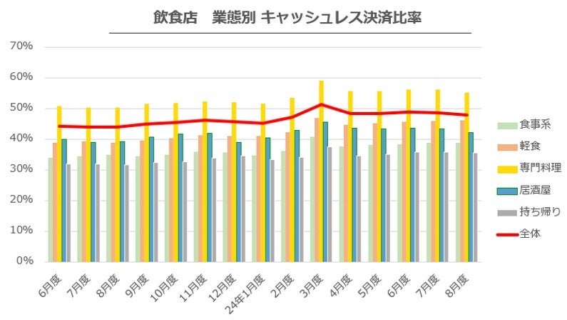 業態別で見ると、キャッシュレス決済利用は、1位の専門料理が50.6%で前月より0.2pt減少した。