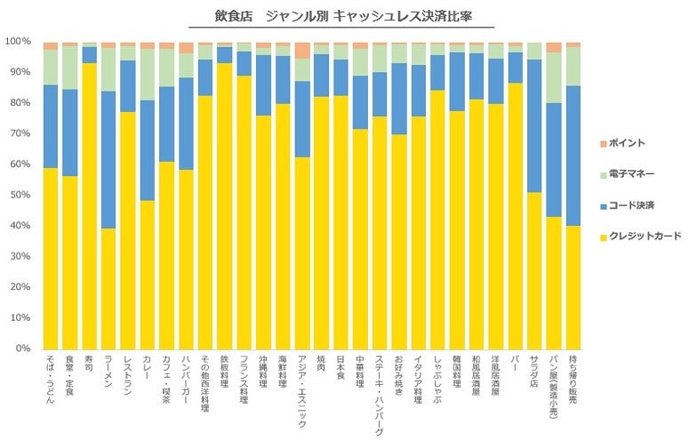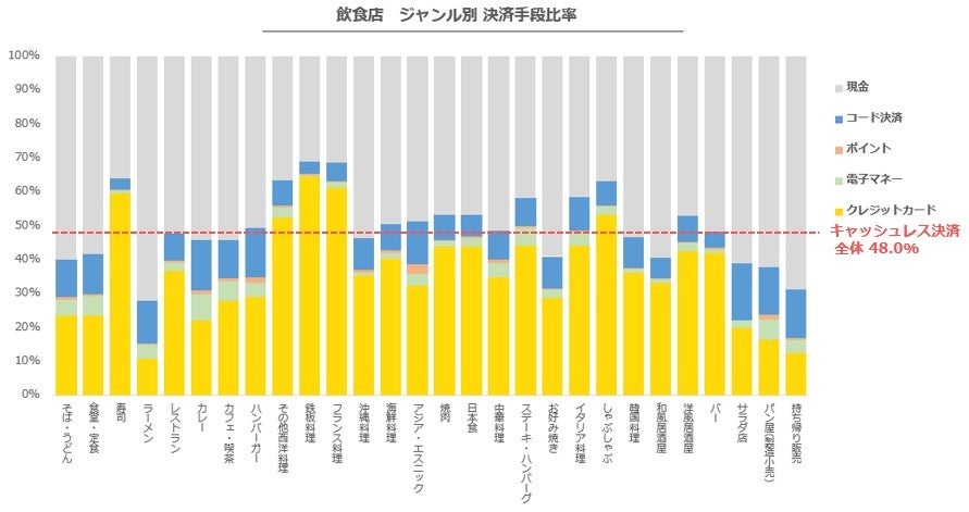 ジャンル別に見ると、寿司・その他西洋料理・鉄板料理・フランス料理・しゃぶしゃぶでキャッシュレス比率が60%を超える。また、コード決済比率が高いサラダ店とカレーでは、その比率が15%を超える。