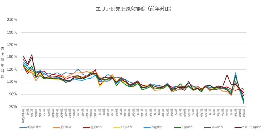 8月売上、前年対比の伸長率(地方平均)は97.9%と前月から2.6pt減少した。各地域の売り上げについては、北海道地方が最も高く前年対比101.1%となった。