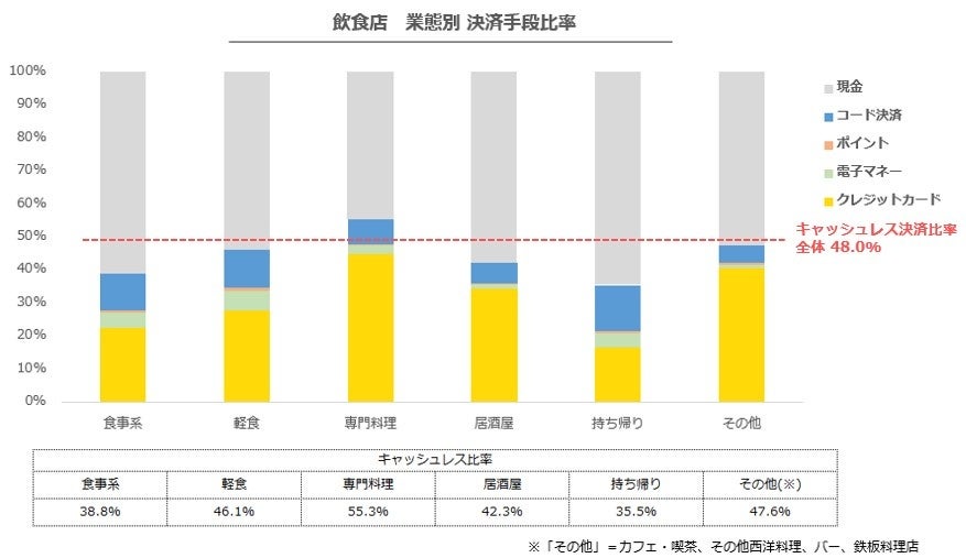 業態別のキャッシュレス比率は、すべての業態で35%以上を超える。