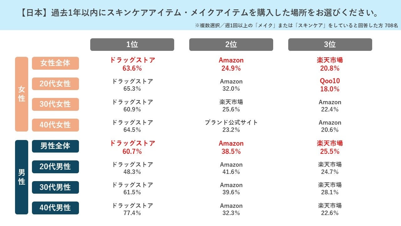 日本では男女ともに1位が「ドラッグストア」(男性:60.7%、女性:63.6%)、2位が「Amazon」(男性:38.5%、女性:24.9%)、3位が「楽天市場」(男性:25.5%、女性:20.8%)となっておりドラッグストアでの購入比率の高さが目立ちます。なお、20代女性は3位に「Qoo10」(18.0%)がランクインしており、若い女性を中心に人気の高さがうかがえます。