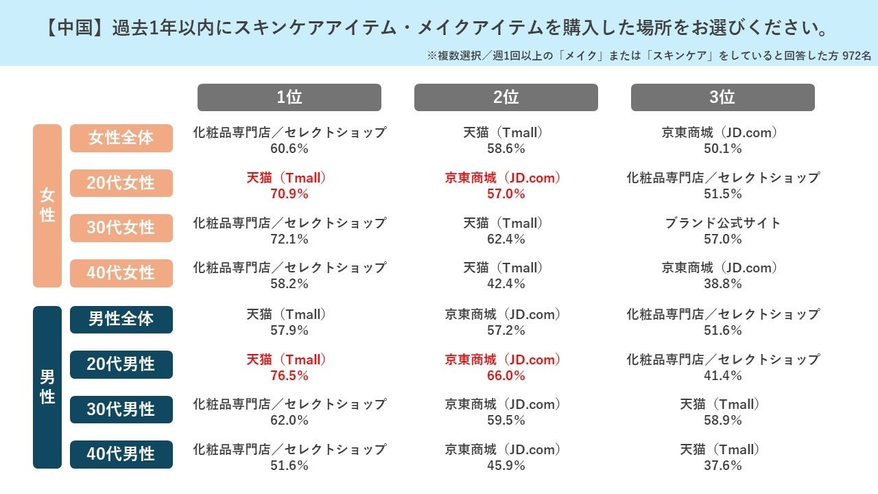 中国では、順位こそ異なるものの、男女いずれも上位3項目を「天猫(Tmall)」「京東商城(JD.com)」「化粧品専門店・セレクトショップ」が占める結果に。年代別にみると、20代では男女ともに1位が「天猫(Tmall)」(男性:76.5%、女性:70.9%)、2位が「京東商城(JD.com)」(男性:66.0%、女性:57.0%)と、若い世代のネットショッピング利用率の高さが目立ちます。一方、男女ともに30代・40代では「化粧品専門店・セレクトショップ」がトップとなっており、実店舗での購入ニーズも大きいことがうかがえます。