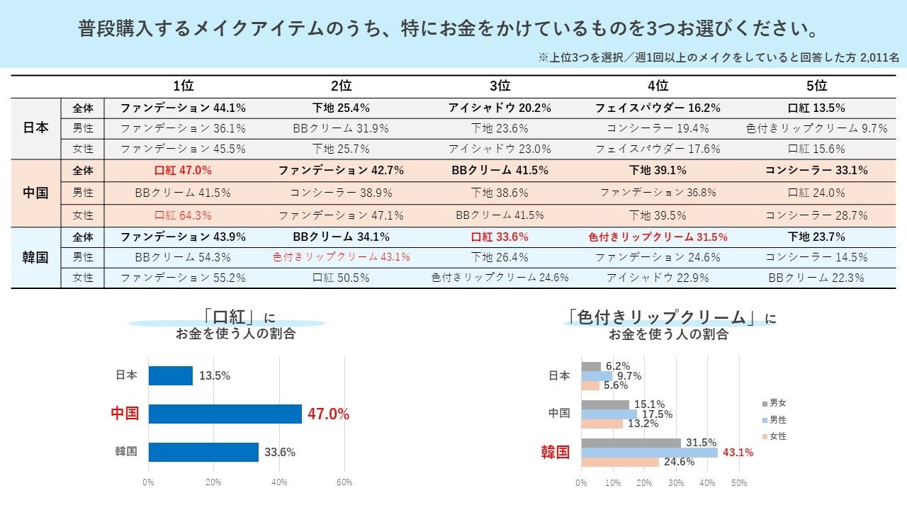 日中韓三か国の美容意識調査【購買行動編】 日本女性は「ベースメイク」、中国・韓国は「口元メイク」重視!