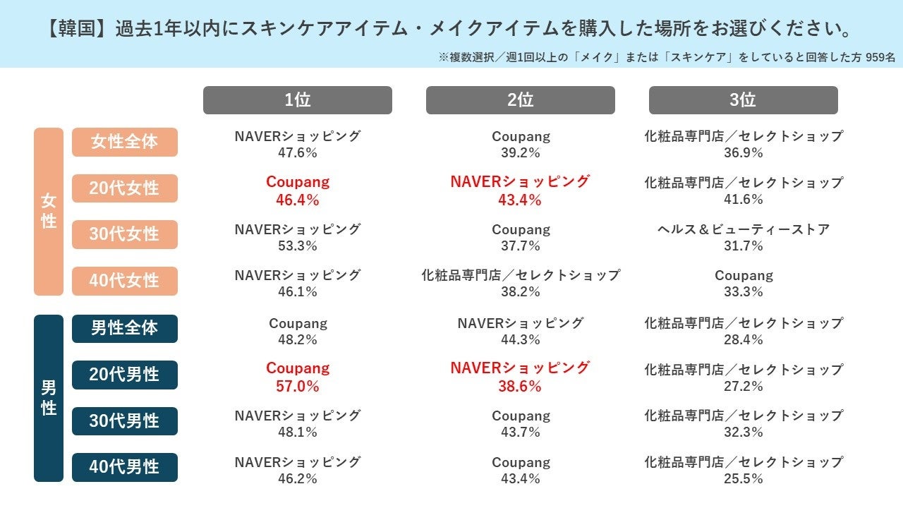 韓国では、順位こそ異なるものの、男女いずれも上位3項目を「Coupang」「NAVERショッピング」「化粧品専門店・セレクトショップ」が占める結果に。年代別にみると、20代では男女ともに1位が「Coupang」(男性:57.0%、女性:46.4%)、2位が「NAVERショッピング」(男性:38.6%、女性:43.4%)と、中国同様若い世代のネットショッピング利用率の高さが目立ちます。なお大きな差ではないものの、男性が「Coupang」、女性が「NAVERショッピング」を比較的多く利用していることも明らかになりました。