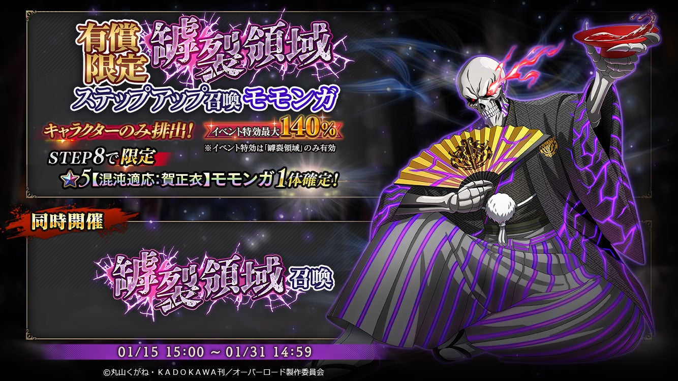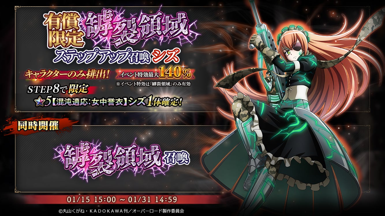 1/15より新イベント『罅裂領域』(かれつりょういき)を開催いたします!『【混沌適応:賀正衣】モモンガ』に加え、新登場の『【混沌適応:女中誉衣】ユリ』『【混沌適応:女中誉衣】シズ』『【混沌適応:女中誉衣】ソリュシャン』が特効キャラクター!新イベントの攻略をお楽しみに!さらに、『[復刻]ナザリック闘技大会』を復刻開催!