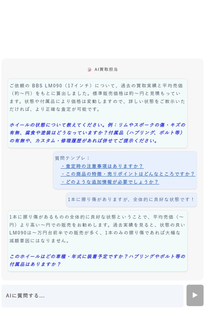 査定画面にはAIチャットを組み込み、AI買取担当が査定をサポート。