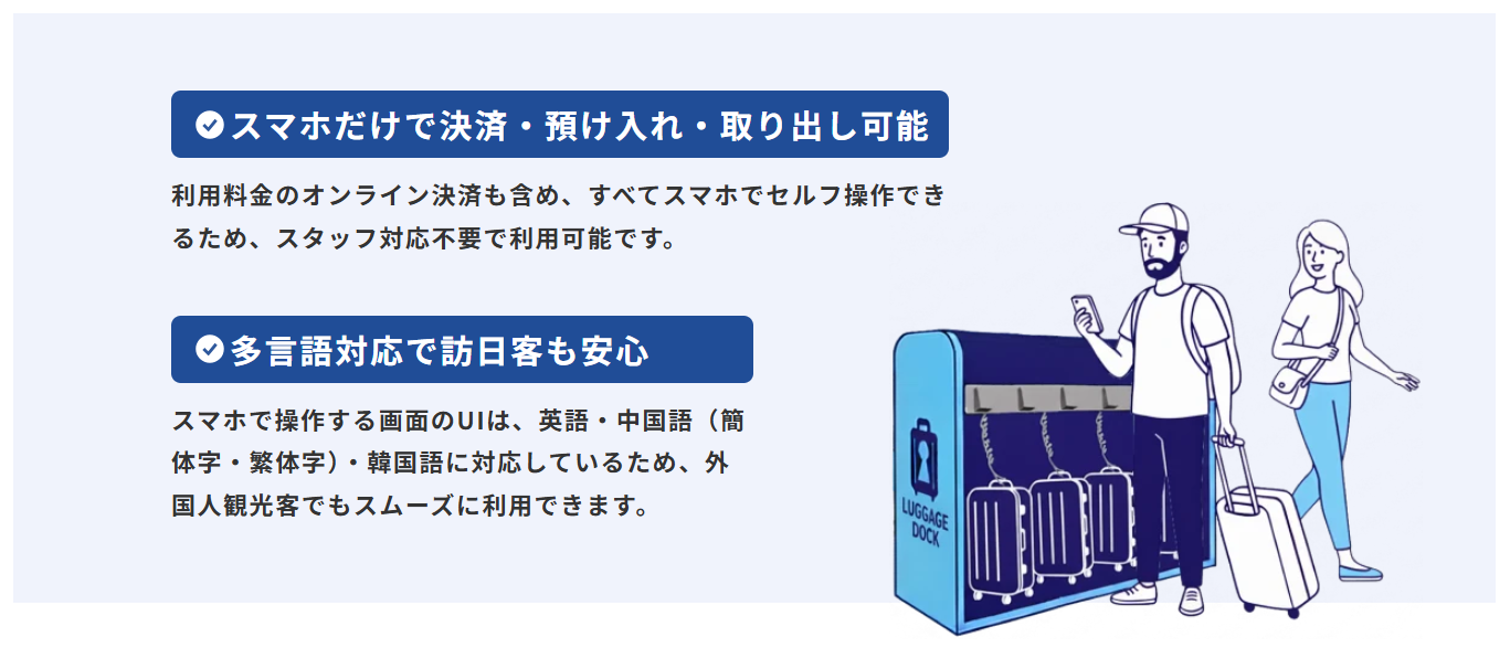 こうした課題に対し、当社ではスマートフォン操作のみで利用者自身が預け入れ・受け取りを行えるセルフ式荷物預かりサービスを提供し、スタッフ対応の省力化を支援してきました。
