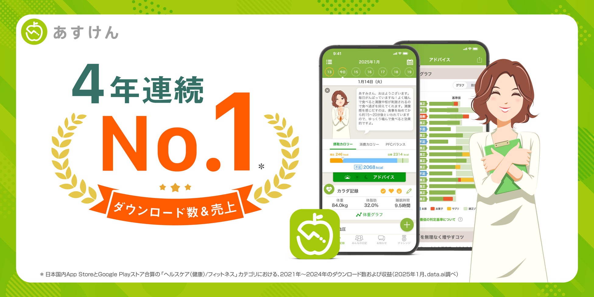 累計会員数1,100万人超・国内No.1*¹のAI食事管理アプリ『あすけん』の開発・運営を行う株式会社asken(東京都新宿区、代表取締役社長 中島洋、以下「当社」)は、アプリ調査会社のSensor Tower(東京都千代田区、日本カントリーマネージャー 松尾蔵人)がdata.aiにて集計した2024年「ヘルスケア(健康)/フィットネス」カテゴリにおいて、アプリダウンロード数・売上ともに国内でNo.1*¹を獲得したことをお知らせいたします。これにより、2021年から4年連続でのNo.1獲得となりました。なお、4年連続No.1はdata.aiの「ヘルスケア(健康)/フィットネス」カテゴリにおいて初の快挙となります。
