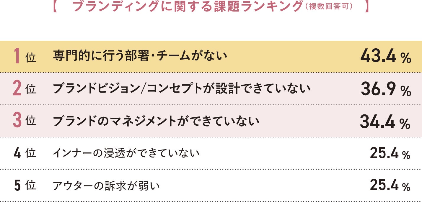 ブランディングにおける課題について尋ねたところ、「専門的に行う部署・チームがない」(43.4%)という回答が最多となりました。次いで「ブランドビジョン/コンセプトが設計できていない」(36.9%)、「ブランドのマネジメントができていない」(34.4%)となり、専門人材の確保・育成とともに、戦略策定に課題があることが浮き彫りとなりました。