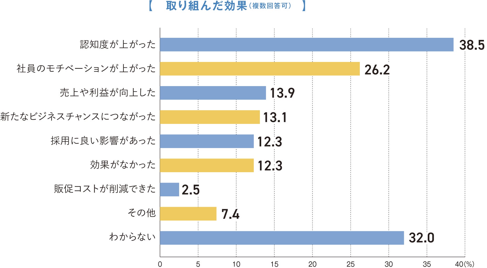 ブランディングに取り組んだ効果について尋ねると、「認知度が上がった」(38.5%)が最多に。次いで「社員のモチベーションが上がった」(26.2%)となり、アウターブランディングだけでなく、インナーブランディングを通じて社員のモチベーション向上に繋がっていることがうかがえます。一方で、「わからない」という回答が32.0%となったことから、ブランディングは効果測定が難しい取り組みであると言えるでしょう。