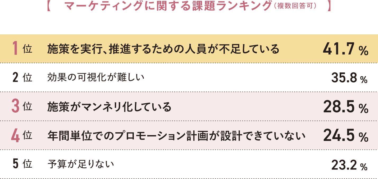 ■マーケティングにおける課題は「施策を実行、推進するための人員が不足している」という回答が4割以上に。