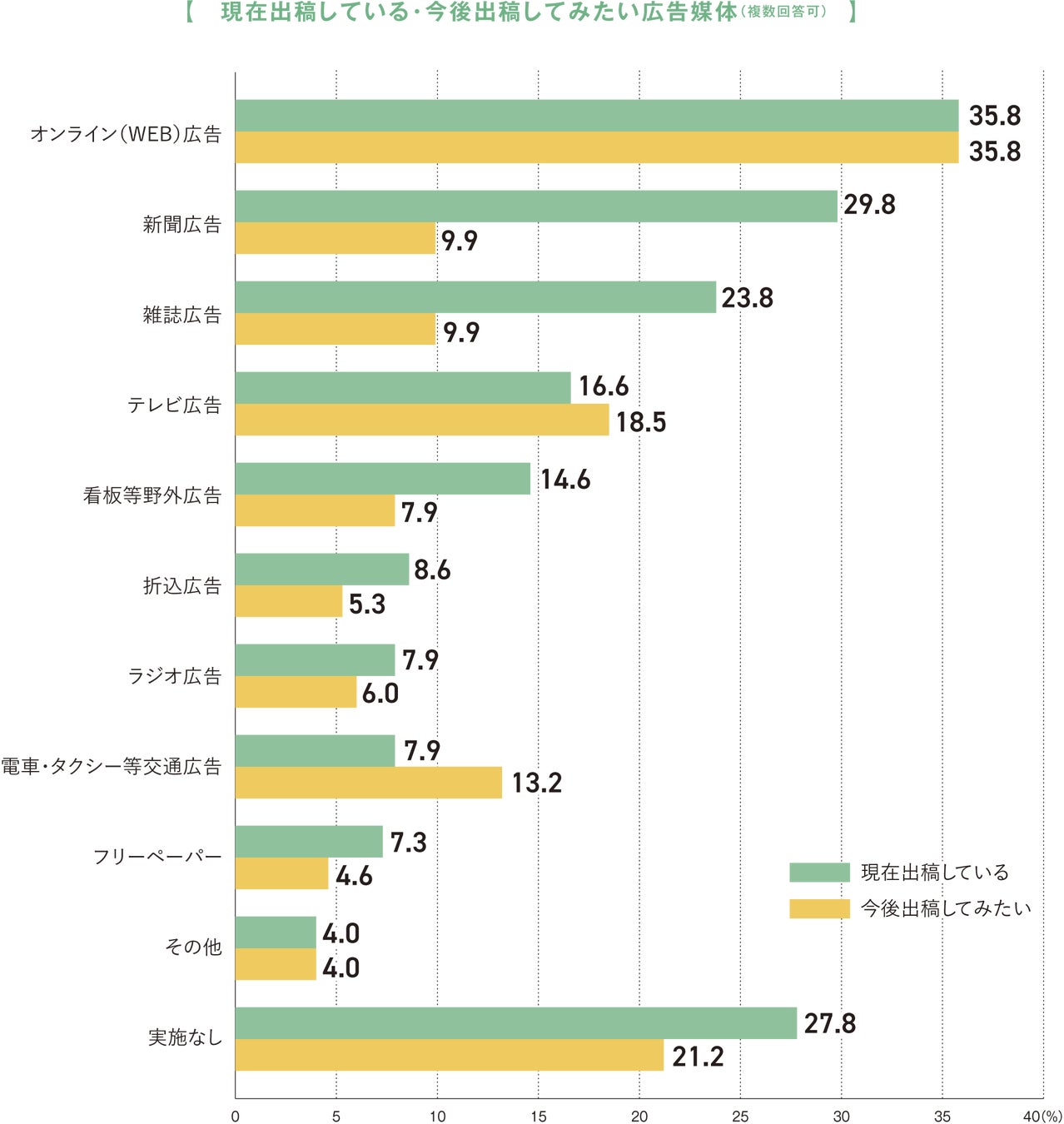 現在出稿している媒体について尋ねると、「オンライン(Web)広告」(35.8%)が最も多く、次いで「新聞広告」(29.8%)、「雑誌広告」(23.8%)という結果に。今後出稿してみたい媒体としても、「オンライン(Web)広告」(35.8%)が最多となりました。