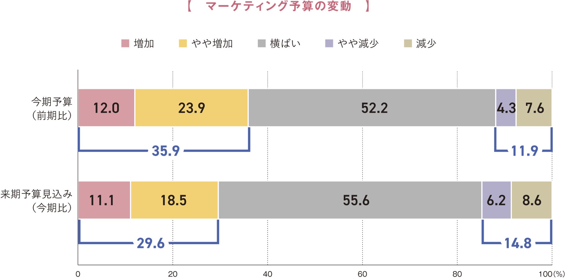 マーケティングの予算傾向について尋ねたところ、今期予算では、前期と比して「増加・やや増加」という回答が35.9%となりました。「減少・やや減少」の11.9%を上回ることから、マーケティングの予算は増加傾向にあることがうかがえます。