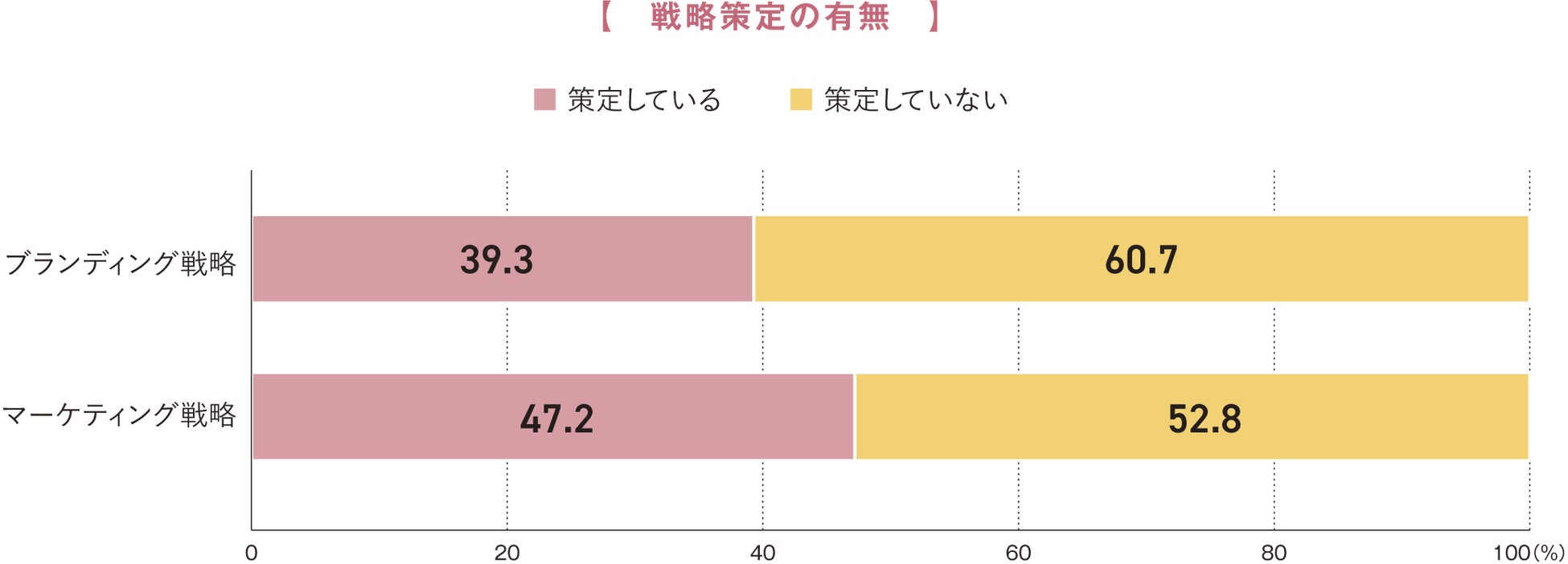 ブランディング戦略およびマーケティング戦略の策定の有無について尋ねたところ、ブランディング戦略については60.7%、マーケティング戦略については52.8%が「戦略策定を行っていない」という結果となりました。半数以上の企業で戦略が策定されていないことが分かります。