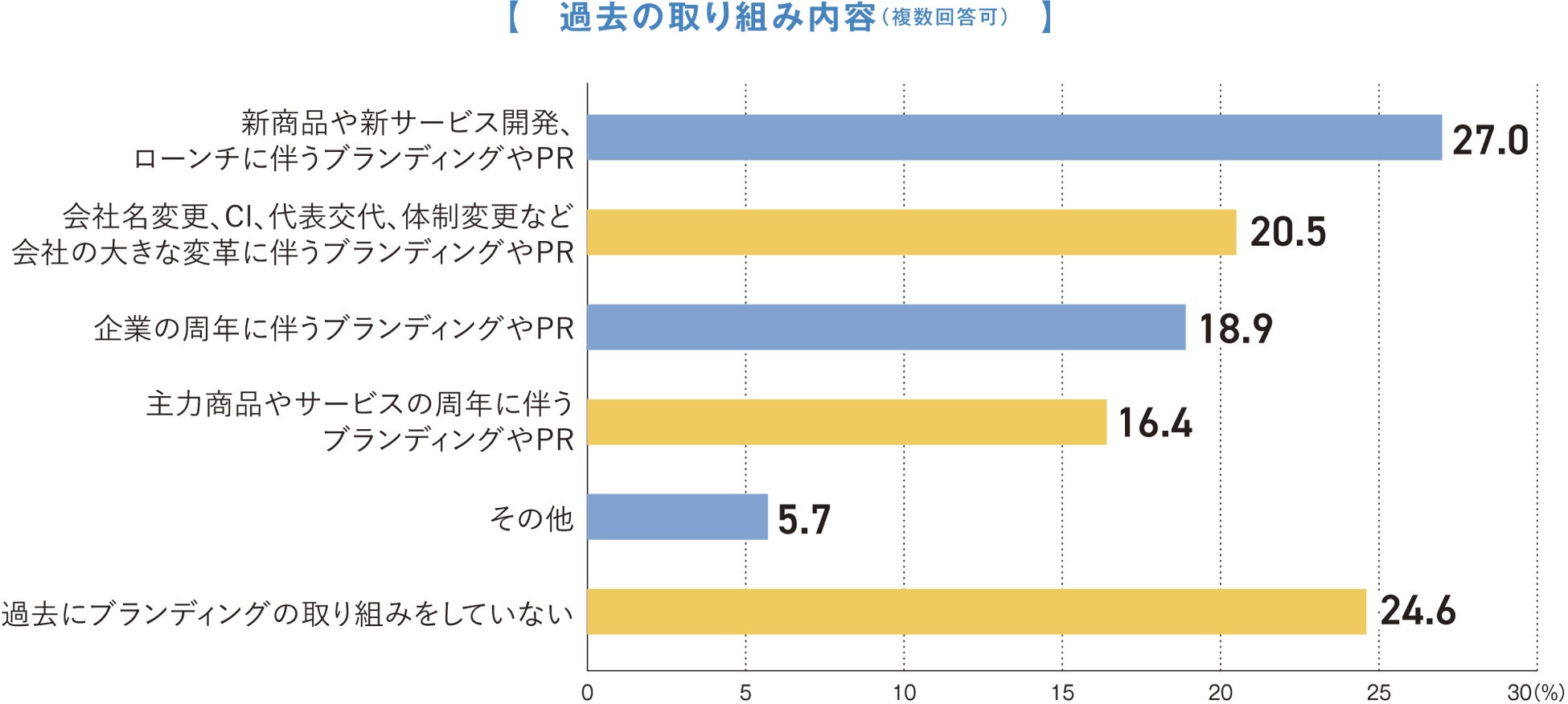 過去のブランディングへの取り組み状況について尋ねたところ、「新商品や新サービスの開発、ローンチに伴うブランディングやPR」(27.0%)が最多となり、次いで「会社の大きな変革に伴うブランディングやPR」(20.5%)、「企業の周年」(18.9%)、「商品やサービスの周年」(16.4%)という結果となりました。会社にとって重要なタイミングを活用して取り組みを行っていることがうかがえます。