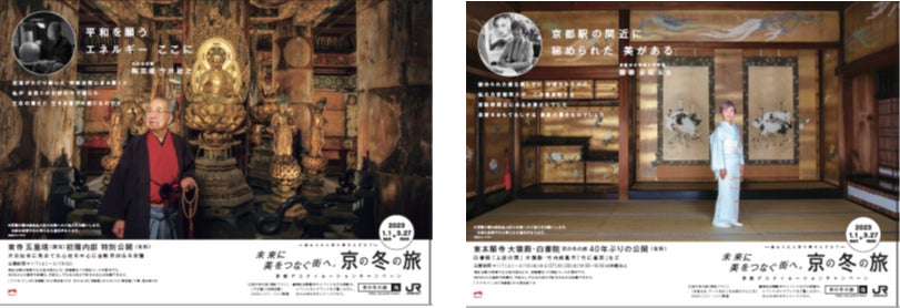 キャンペーン期間中、JRグループの各駅・車内ポスターには、美術工芸の世界で親子3代で創作に取り組む今井家(今井政之氏/陶芸家、今井眞正氏/陶芸家、今井裕之氏/金石造形作家、今井完眞氏/陶芸家)、京都市立芸術大学学長で画家の赤松玉女氏に御出演いただき、京の文化の魅力を御紹介します。
