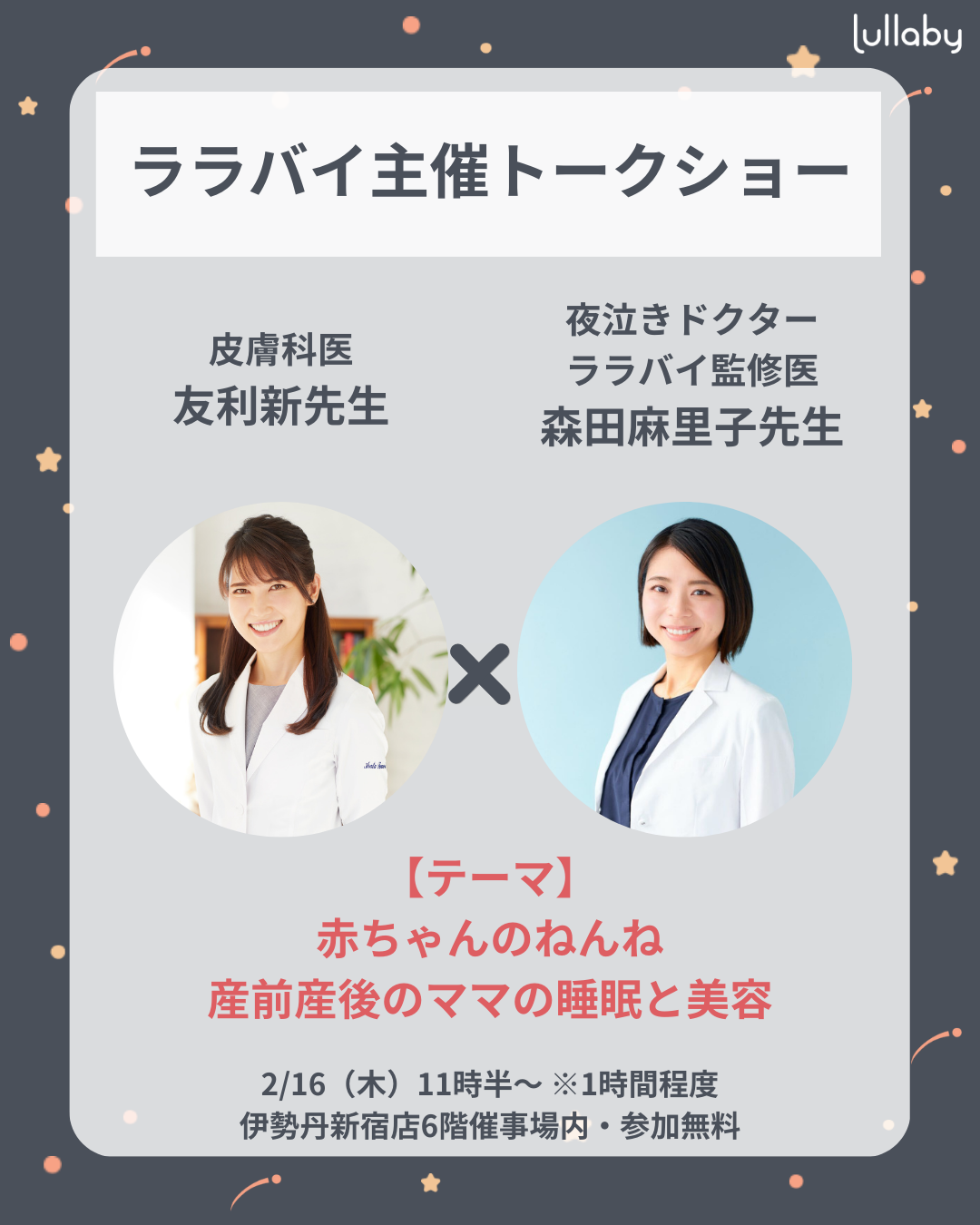 2023年2月16日(木)に内科・皮膚科医 友利新先生 × アプリLullaby監修医・睡眠専門家 森田麻里子先生による「あかちゃんのねんね、産前産後のママの睡眠&美容について」のトークショーを開催。
