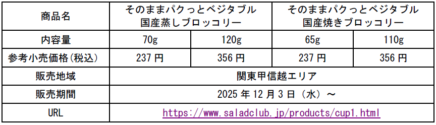 株式会社サラダクラブ(代表取締役社長:新谷昭人、本社:東京都調布市)は、当社初となる、トレー付きトップシール容器を採用し、加熱工程を加えた新シリーズの第一弾として「そのままパクっとベジタブル 国産蒸しブロッコリー」と「そのままパクっとベジタブル 国産焼きブロッコリー」を2025年12月3日(水)から新発売します。