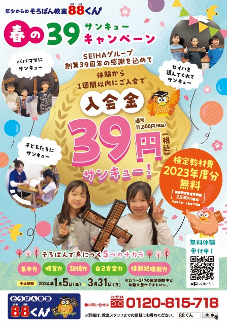 【そろばん教室88くん】では、2024年1月5日~3月31日まで、ご入会いただくお客様に感謝の気持ちを込めて「春の39キャンペーン」を実施しております。