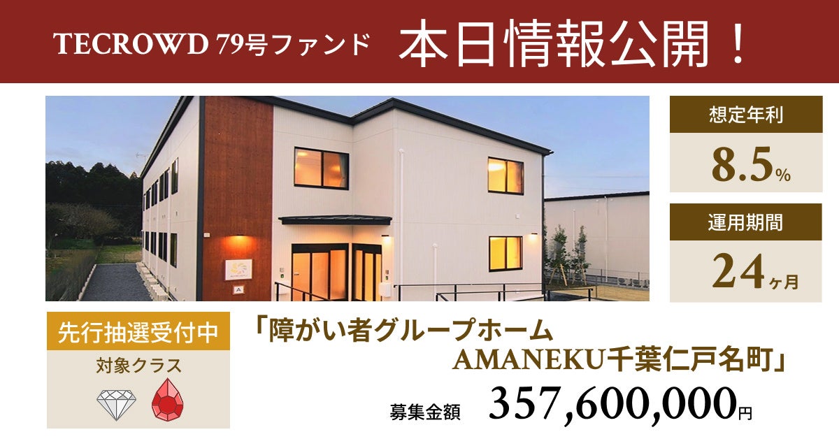 この度新たにTECROWD79号ファンド「障がい者グループホーム AMANEKU千葉仁戸名町」の情報を2025年3月26日(水)より情報公開と先行抽選受付を行い、2025年4月8日(火)18時より募集を開始いたします。