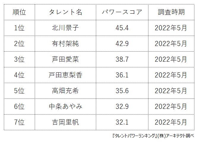 本ランキングは、2022年5月度に実施したタレント調査データ(一部過去実施データ)を利用し、タイトルに応じてランキング形式でまとめたものです。