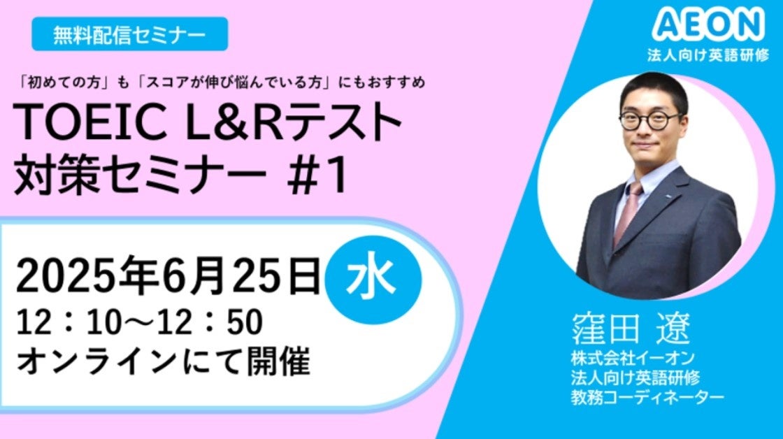 英会話教室を運営する株式会社イーオン(本社:東京都新宿区、代表取締役社長:重野卓、以下「イーオン」)は、2025年6月25日(水)を第1回として、「TOEIC(R)L&Rテスト」のスコアアップが課題の企業人事ご担当者向けに無料オンラインセミナー全3回を開催します。