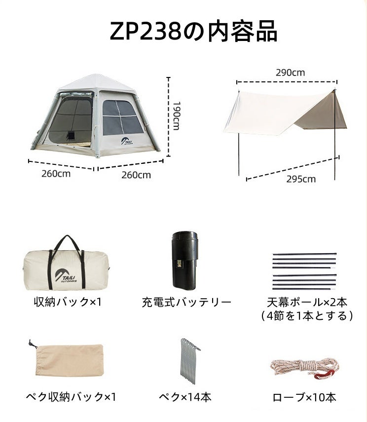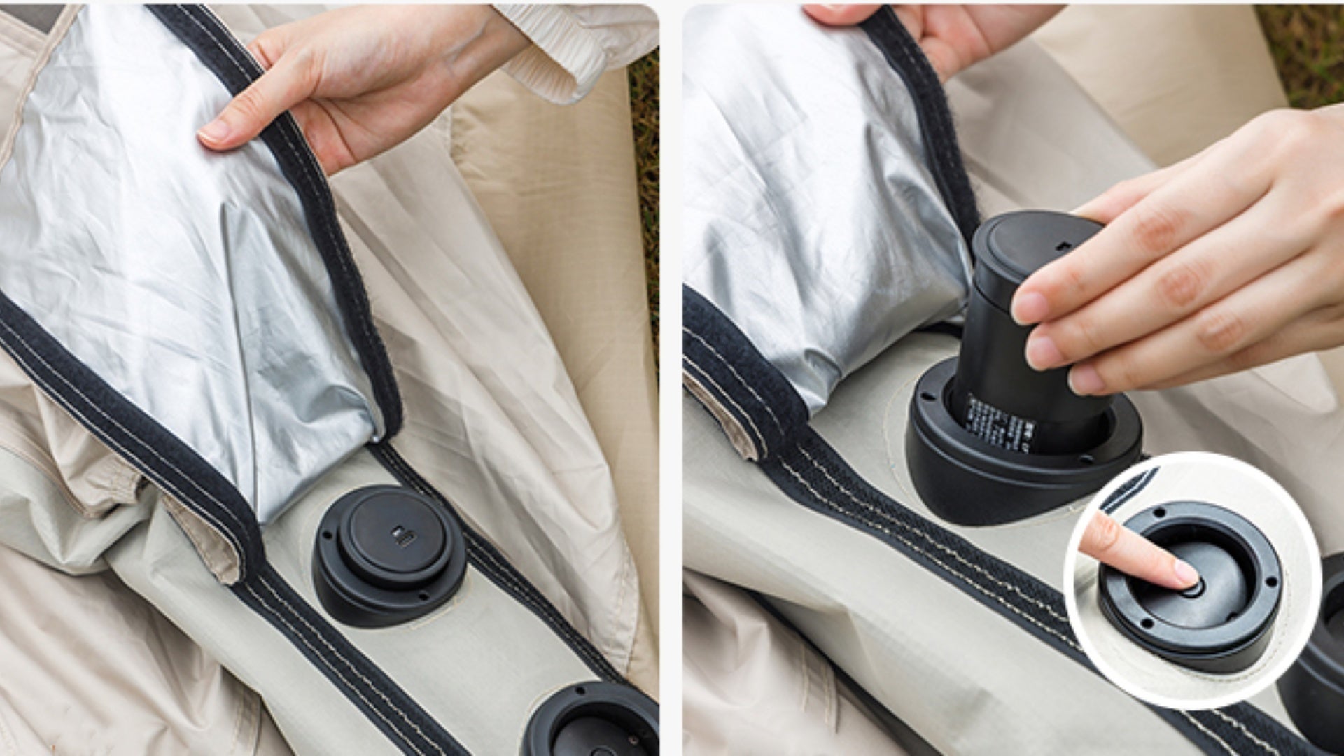 内蔵充電式バッテリー、ワンタッチで膨らみ、満タンで自動停止、アウトドア初心者でも一人でできます。