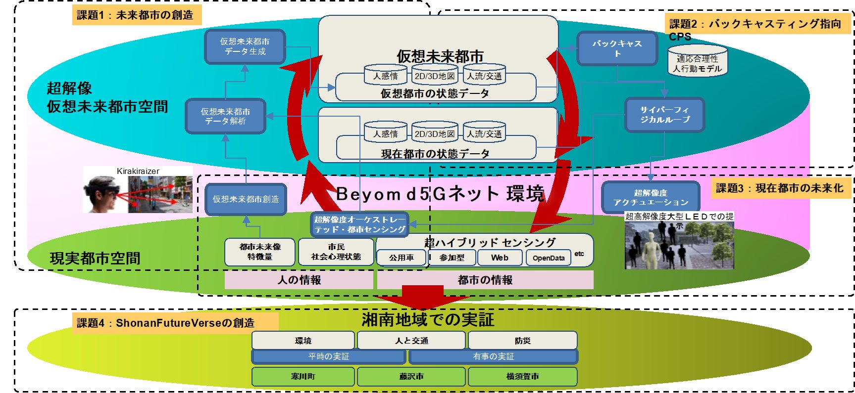 都市のサステイナブルかつレジリエントな発展の「未来像」に着目し、多様な人々が仮想空間内に作成/編集/共有する「未来像」を起点としてバックキャスト指向で動作するCyber Physical System (CPS) オーケストレーションと、Beyond5Gネットワークによる超解像度情報生成・配信・アクチュエーションからなる未来都市情報基盤を構築し、特に環境および防災の面で神奈川県南部湘南地域にて広域実証を行います。