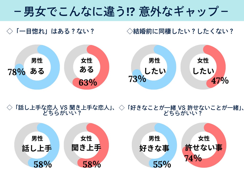 男性は恋愛に「楽しさ」や「ポジティブな共有」を求めるのに対し、女性は価値観の土台が合うことを重要視しているようです。この違いは、恋愛を「感覚的に楽しむ男性」と「安心感や安定を求める女性」という傾向を表しているといえます。