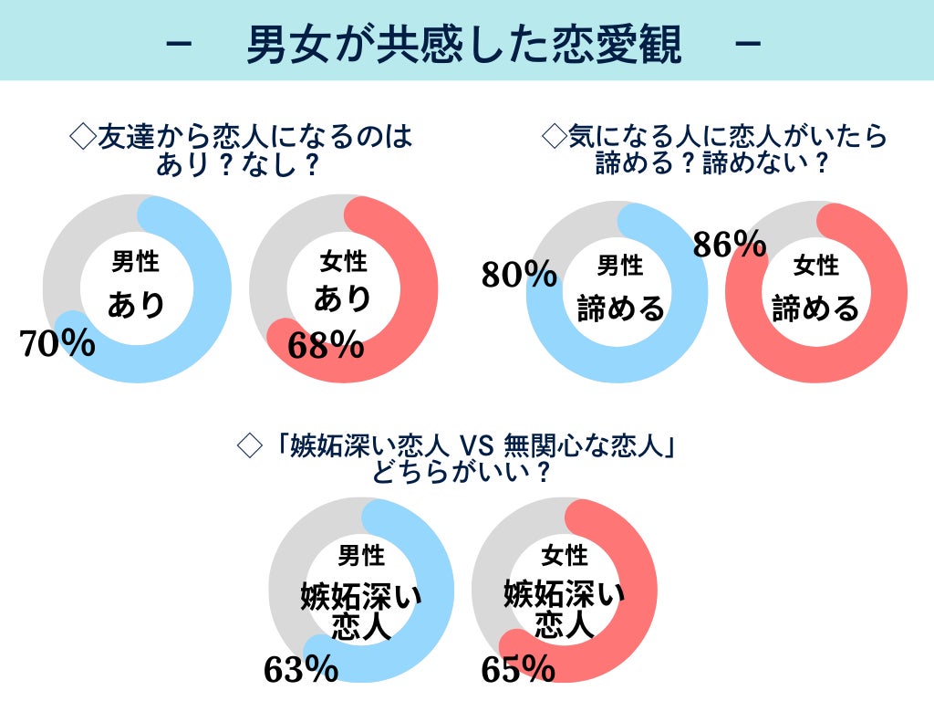 これらの結果は、恋愛観が性別や時代背景によって多様化している現代の社会を映し出しています。「一目惚れ」や「同棲」など、価値観が大きく分かれるテーマでは、互いの違いを尊重しながら歩み寄る必要があります。一方で、「友達から恋人」「気になる人に恋人がいたら諦める」など、共通の価値観が見られる部分では、男女間の信頼関係や倫理観が深まっていることが示されています。