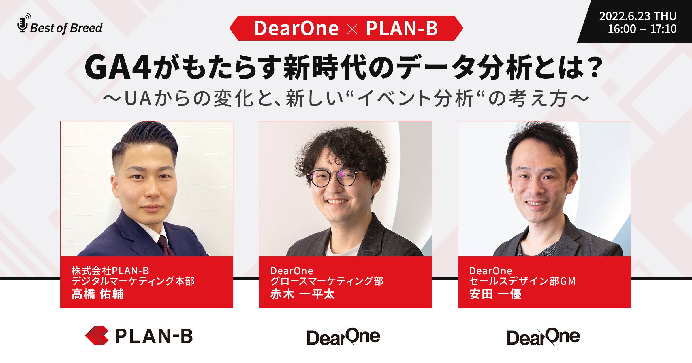 株式会社DearOne、株式会社PLAN-Bの2社による、GA4の基本と「イベントベースでのデータ分析」における考え方や活用方法をご紹介するセミナーを開催いたします。