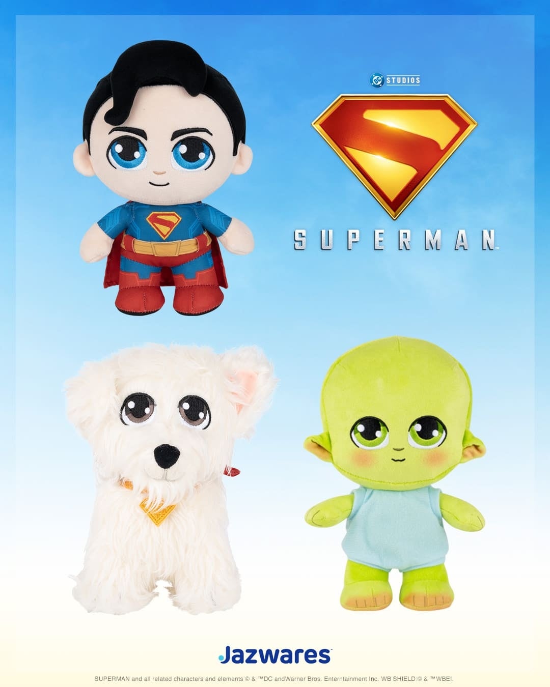ジャズウェアより、映画『スーパーマン』に登場するスーパーマン、クリプト、ベイビージョーイの可愛いぬいぐるみが登場!サイズは高さ約20cm。デフォルメされたデザインながら、コスチュームや毛並みなど、こだわって再現されている。