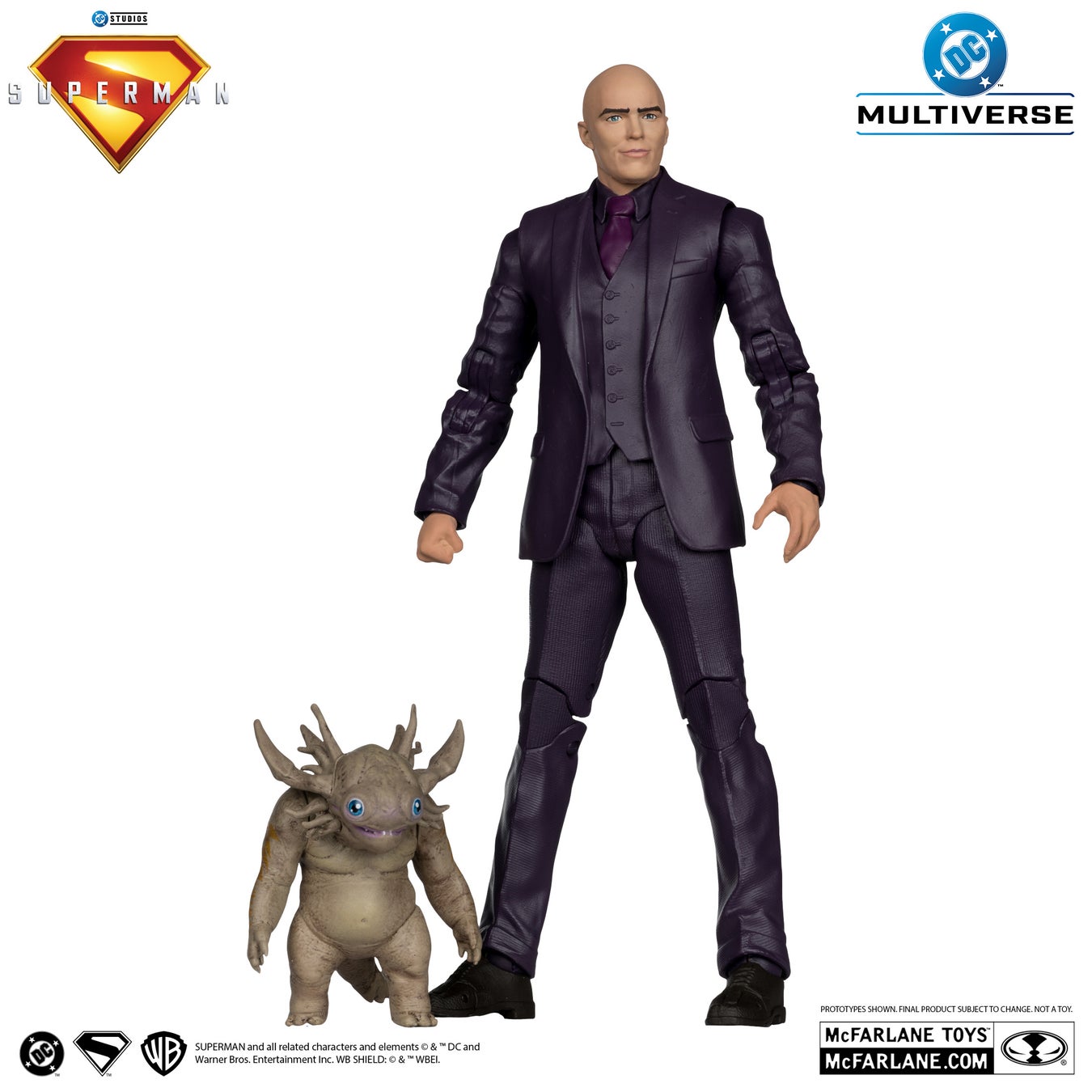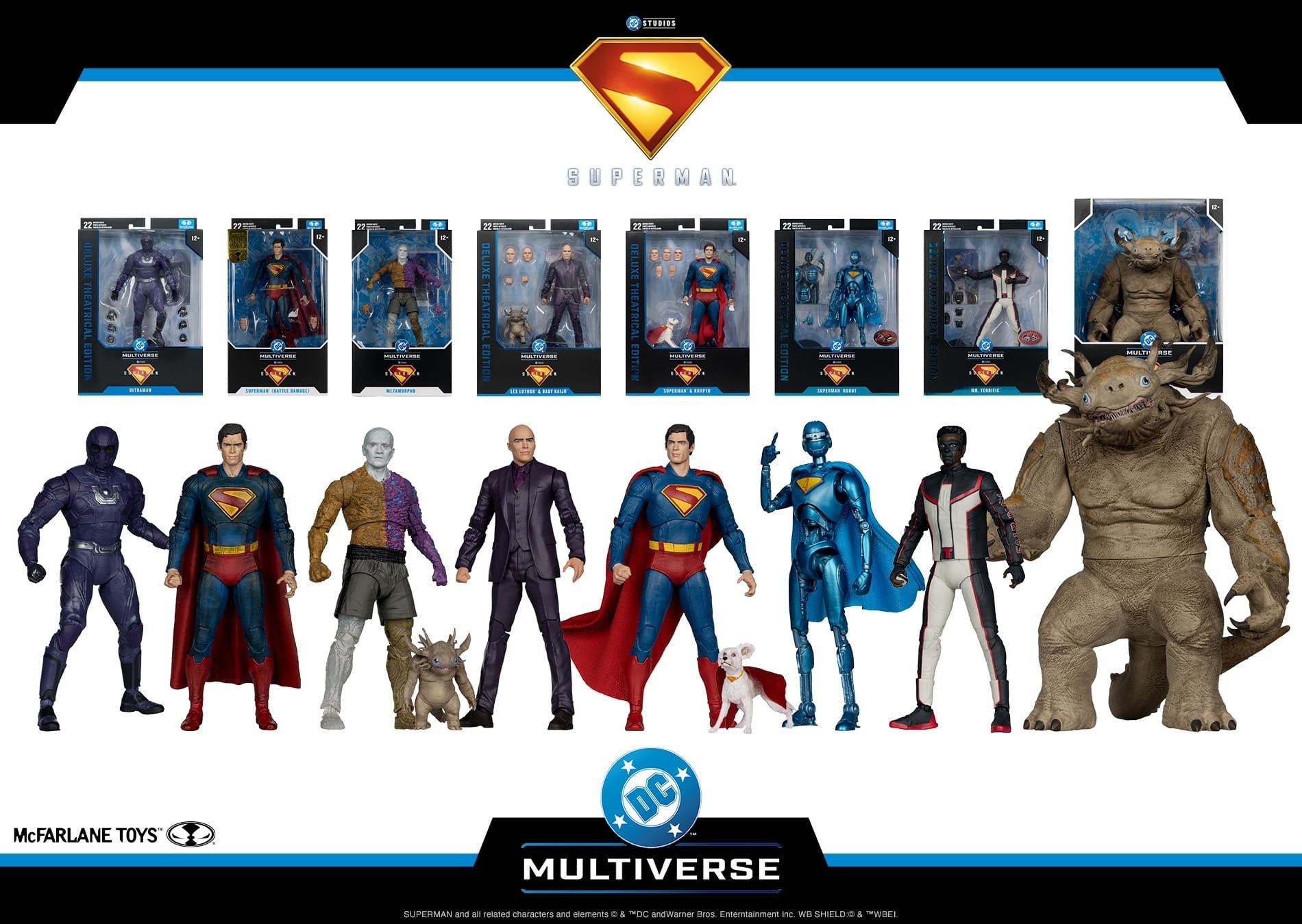 高い造形力とクオリティーに定評のあるマクファーレン・トイズがお贈りする、7インチ・アクションフィギュア「DCマルチバース」シリーズに、映画『スーパーマン』のキャラクターが登場!ラインナップは、スーパーマン&クリプト、レックス・ルーサー&ベイビーKAIJU、ミスター・テリフィック、スーパーマンロボ4号、ウルトラマン、メタモルフォ、スーパーマン(バトルダメージ)の7種。それぞれ高さ約18cm、約22箇所が可動する。また、7インチ・フィギュアにスケールを合わせた大きめのサイズのフィギュアとして、高さ約25cm、数箇所が可動するKAIJUがラインナップしている。