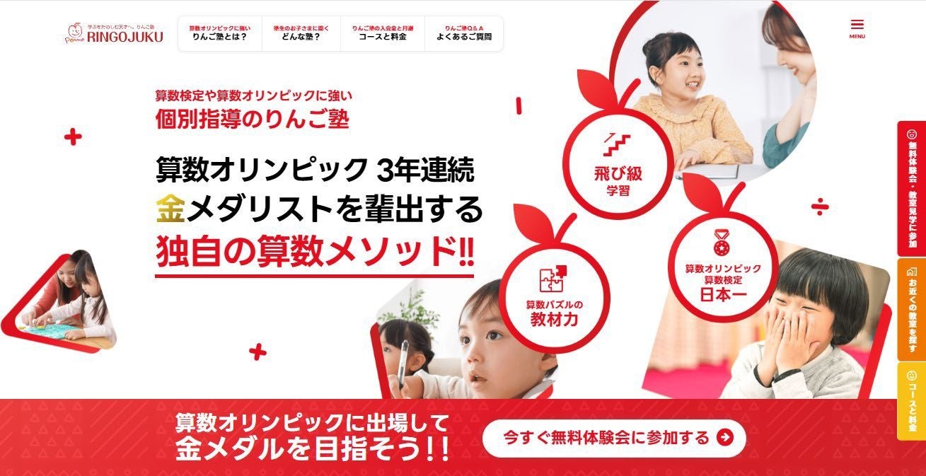 「りんご塾」は算数オリンピックを目標とし、考え抜かれたりんご塾専用教材を使用した授業で「総合的な算数力」を育てながら、学力テスト・算数検定・思考力検定などの各種検定を利用して、スモールステップで成功体験を積み重ねていくことで、「できる!」を実感してもらい、子どもたちの自己肯定感を高める学習プログラムです。