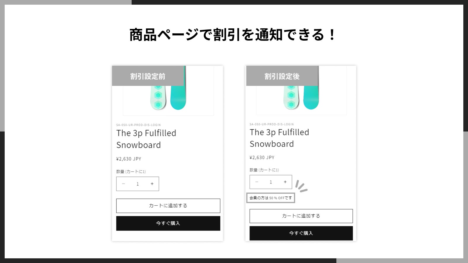 「シンプル会員初回商品割引|お手軽初回ログイン商品セール設定」では、割引が設定されている商品で、割引率の情報などを表示することができます。どのように表示するかは、ノーコードでカスタマイズ可能です。