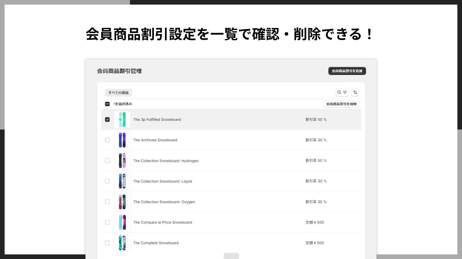「シンプル会員初回商品割引|お手軽初回ログイン商品セール設定」では、ログイン後の初回購入で割引する商品の設定を簡単にできます。直感的な管理画面で Shopify の操作に不慣れな方でも、安心してご利用いただけます。