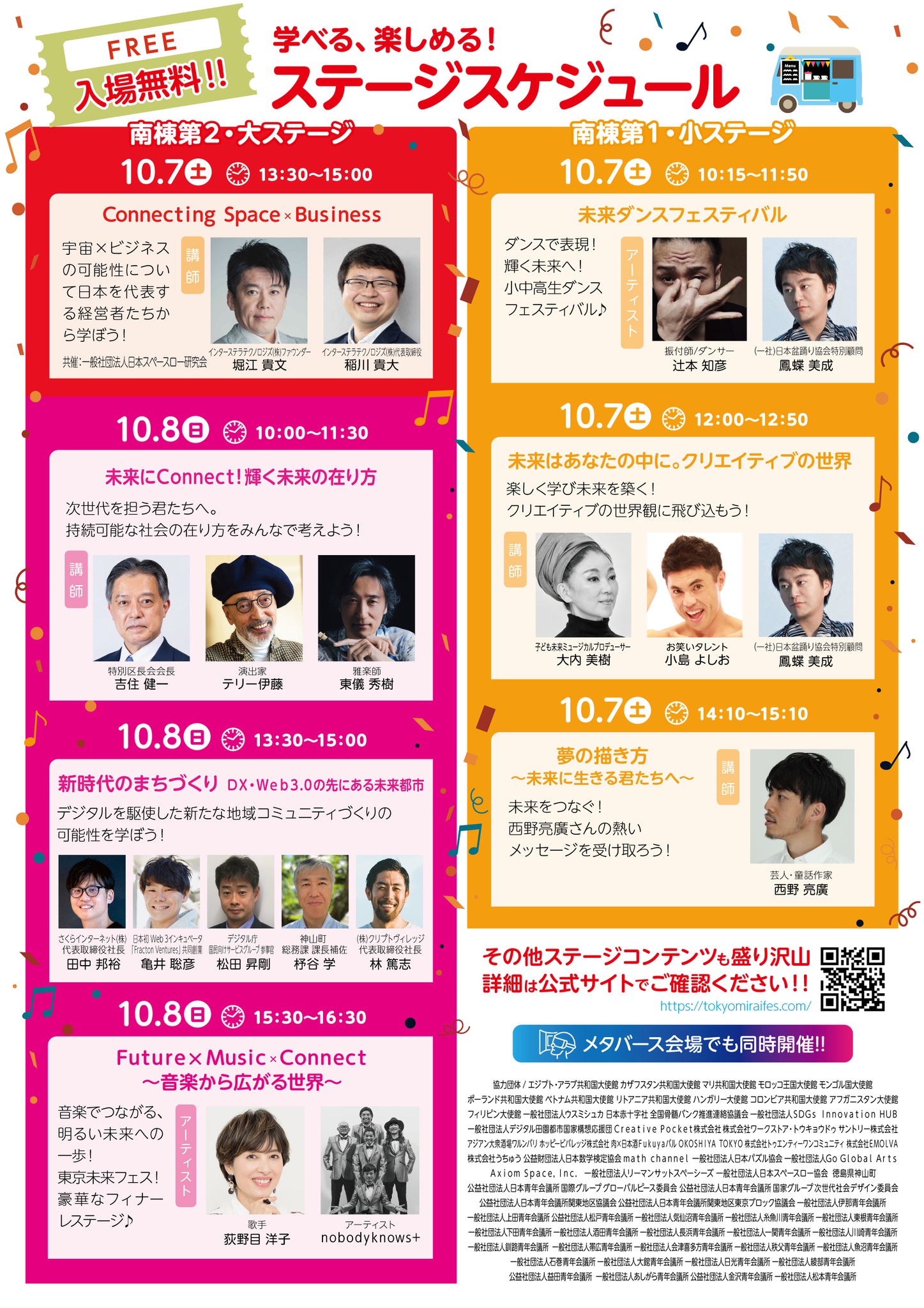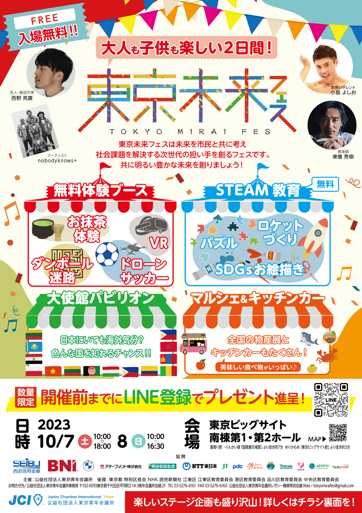 ~東京未来フェス~(主催:公益社団法人東京青年会議所)は、音楽と体験を通じて参加者が楽しむ中で、未来に関する学びの場を提供し、共通のビジョンや社会的課題に取り組む次世代の担い手を育てるフェスです。