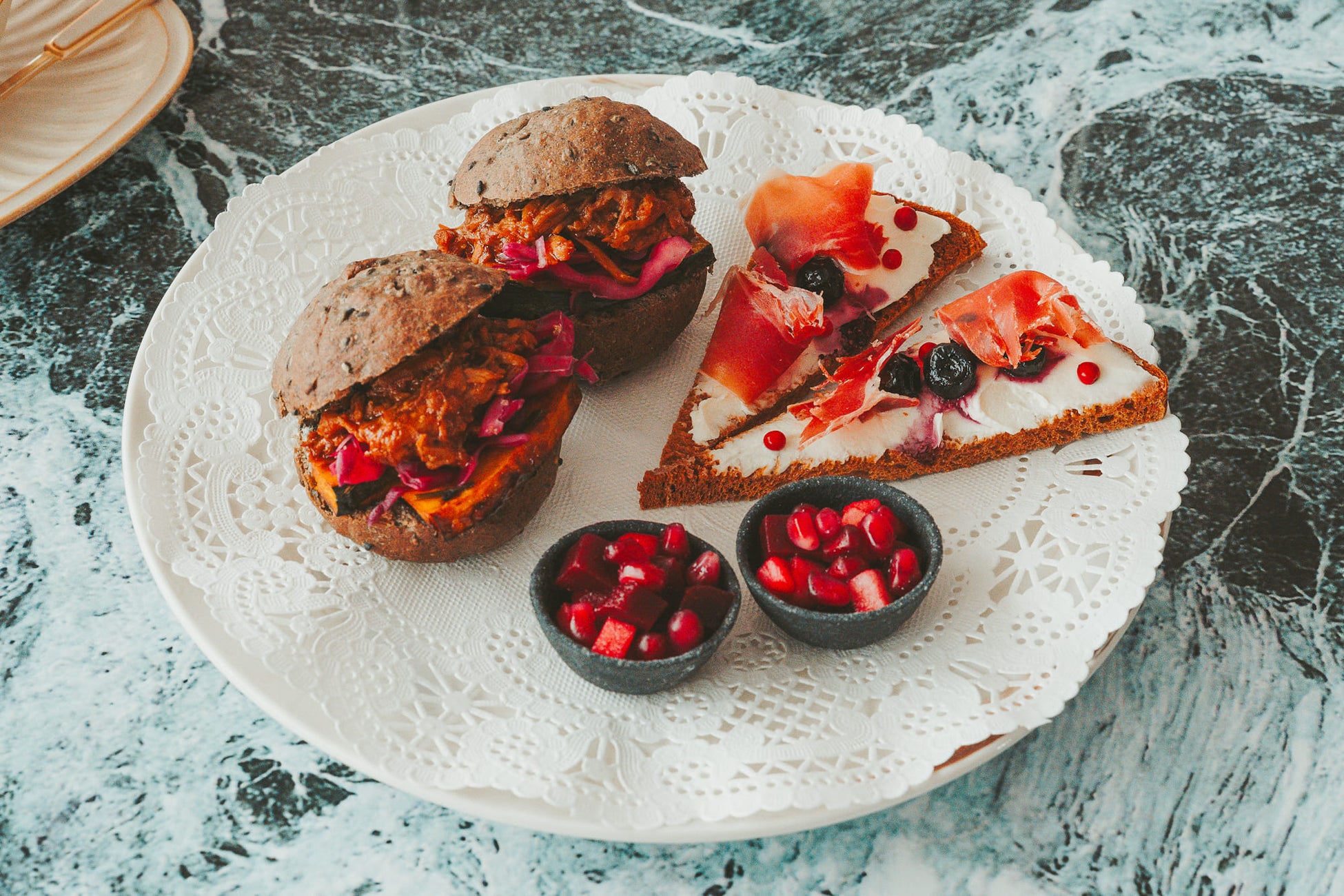 生ハムとサワークリームにブルーベリーを合わせたオープンスタイルのサンドイッチです。