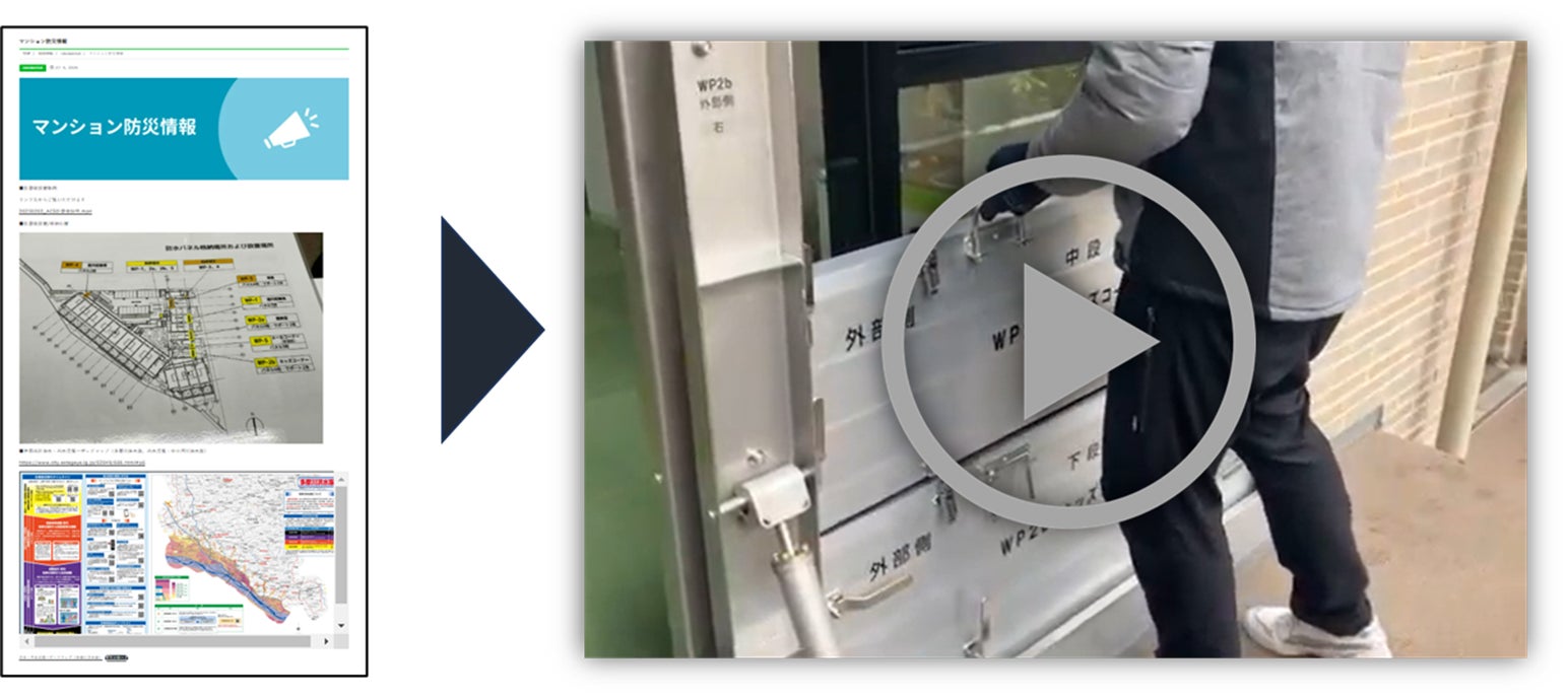 当日訓練に参加できない住人や、いざと言う時に使い方が分からないという事態に備えて、防潮板の設置方法を動画撮影し、GOKINJOアプリからいつでも閲覧出来るようにしました。また、防潮板の格納位置やマンション周辺のハザードマップ等、「マンション防災に関する情報」をまとめた書庫をGOKINJOアプリ内に設け、住人限定でいつでも閲覧可能な仕組みを構築しました。