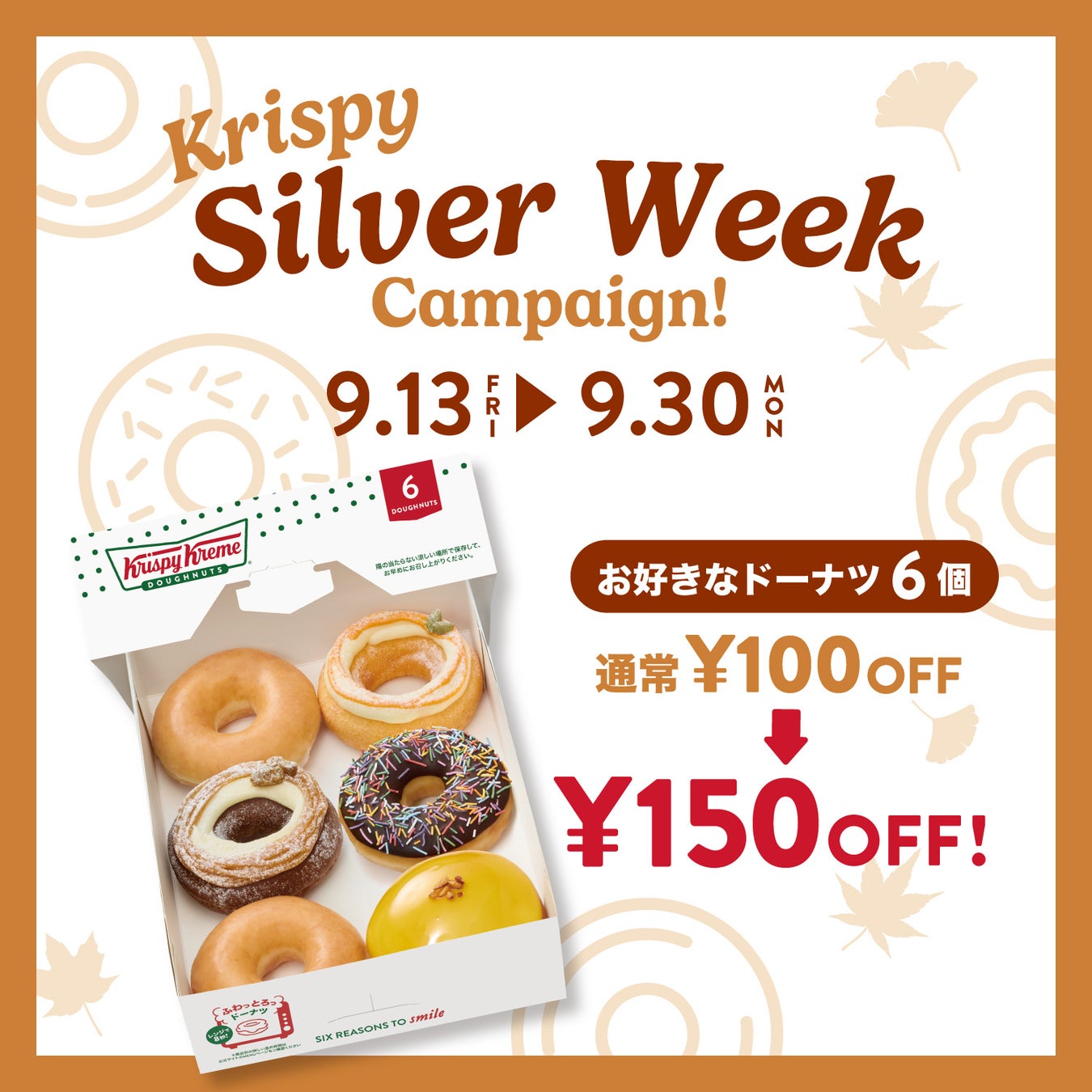 クリスピー・クリーム・ドーナツ・ジャパン株式会社(本社:東京都渋谷区、代表取締役社長:若月 貴子、以下:KKDJ)は、お好きなドーナツ6個を本体価格より150円引きで販売する『Krispy Silver Week Campaign』を、2024年9月13日(金)から9月30日(月)の期間限定で、クリスピー・クリーム・ドーナツ店舗※1 にて実施します。※1 Mercedes me Haneda Airport店及び、催事店舗、KKD店舗以外の小売店を除く