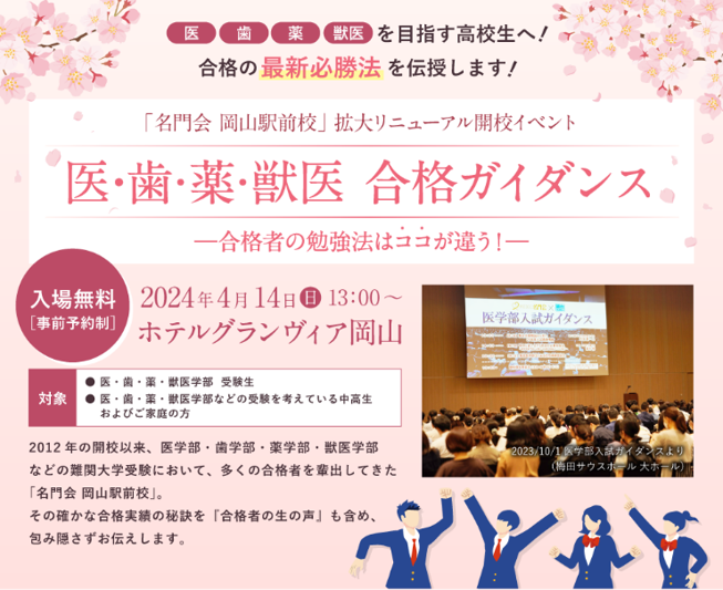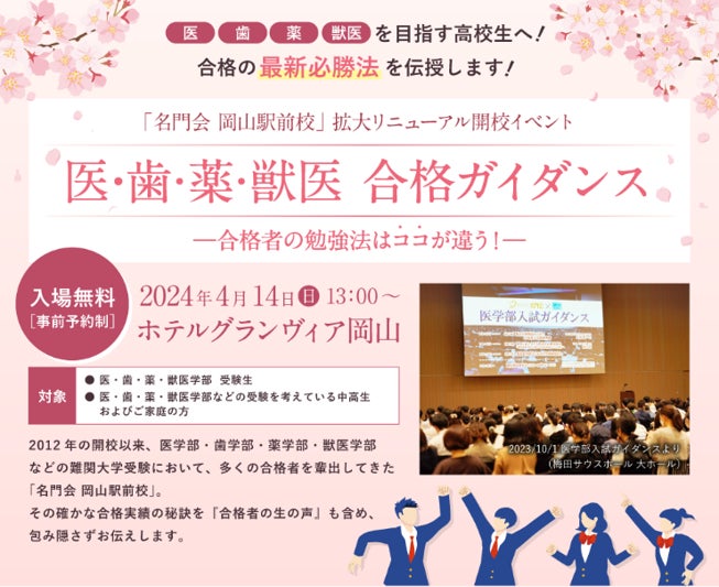 【 「名門会 岡山駅前校」拡大リニューアル開校イベント】“医・歯・薬・獣医 合格ガイダンス”を開催~多くの合格者を輩出した「名門会 岡山駅前校」の秘訣を伝授~